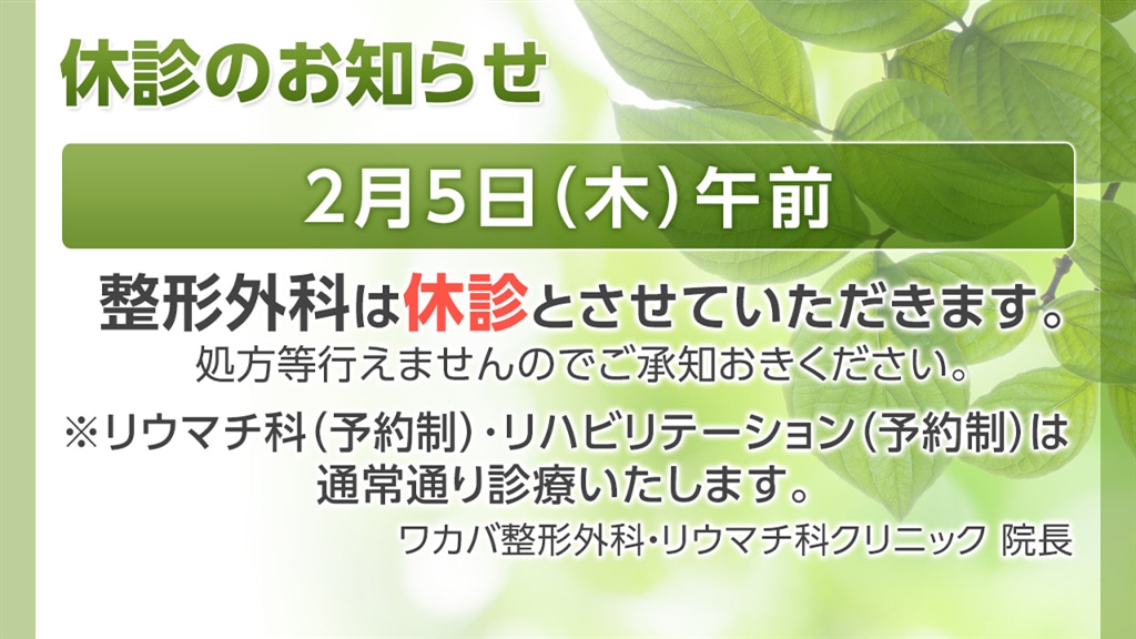 2月5日(木)午前 整形外科休診のお知らせ(ワカバ整形外科・リウマチ科クリニック)