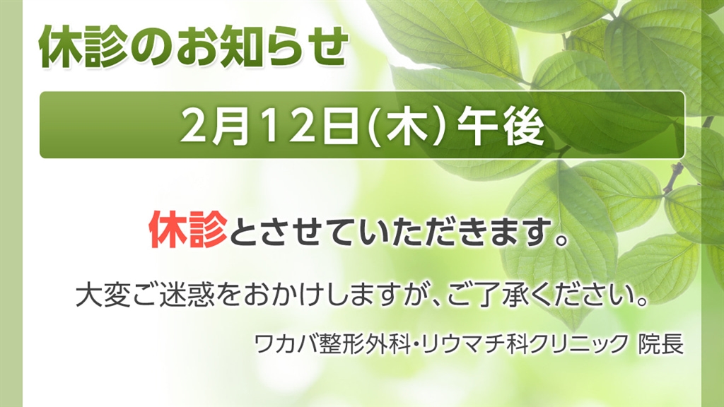 2月12日(木)午後 整形外科休診のお知らせ(ワカバ整形外科・リウマチ科クリニック)