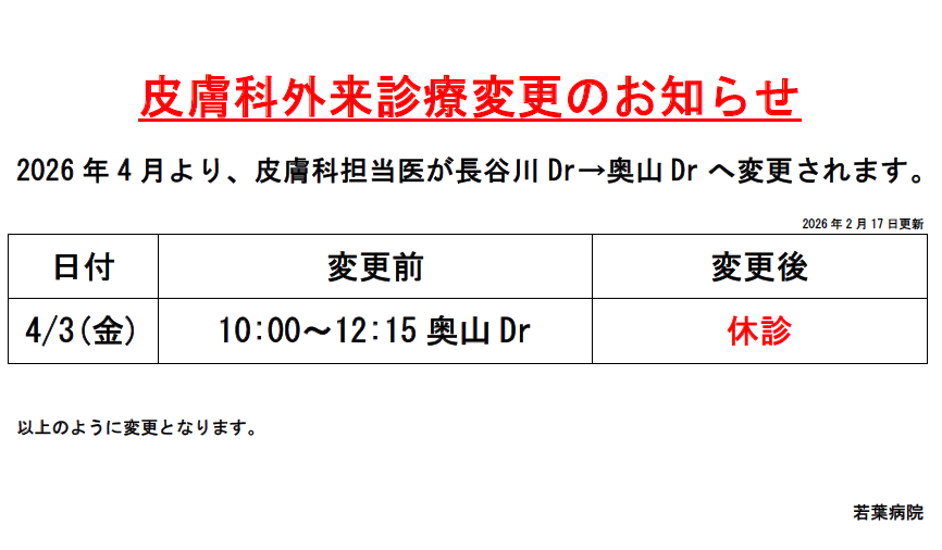 外来診療変更のお知らせ(皮膚科)(若葉病院)