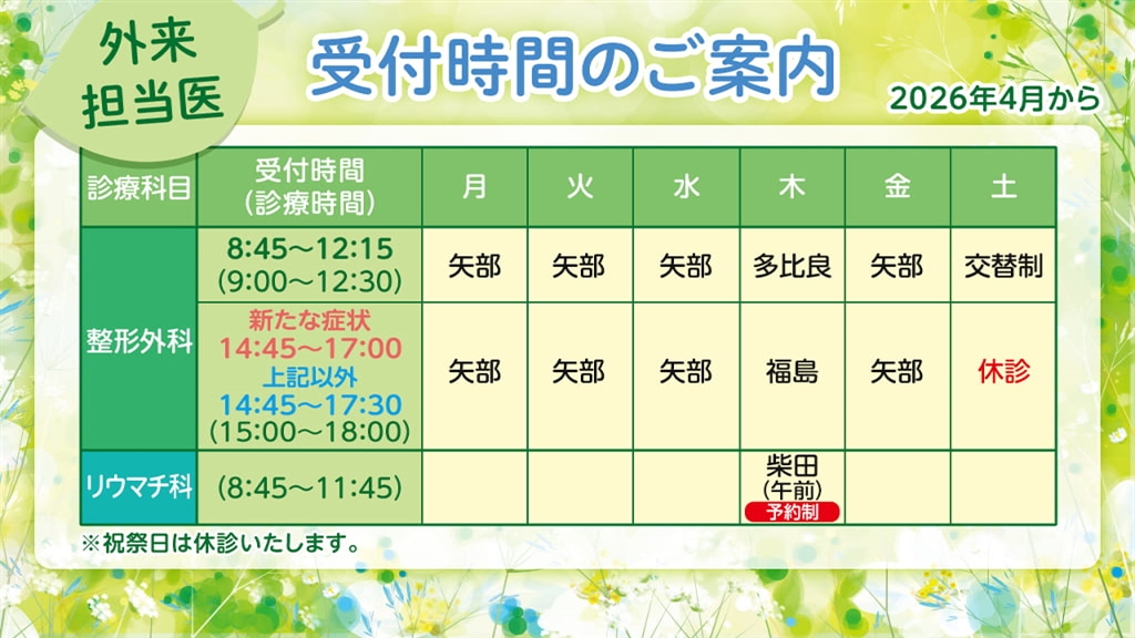 受付時間のご案内【2026年4月から】ワカバ整形外科・リウマチ科クリニック