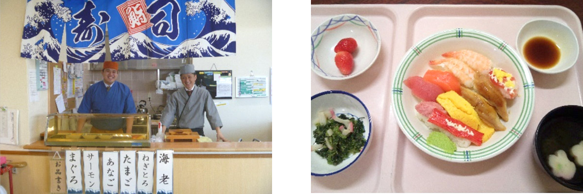 大きく分けると、常食と治療食の2種類があります。脳血管疾患や加齢により嚥下機能(飲み込みの機能)が低下した患者様へは、嚥下調整食など患者様の状態に合わせた食事を提供しています。入院期間が長期の患者様もいるため、365日で異なったメニューの提供を心がけています。月に1回以上は行事食を取り入れ、入院中でも季節感を感じていただけるように工夫をしています。また、年に1回、握り寿司のイベントも行っております。